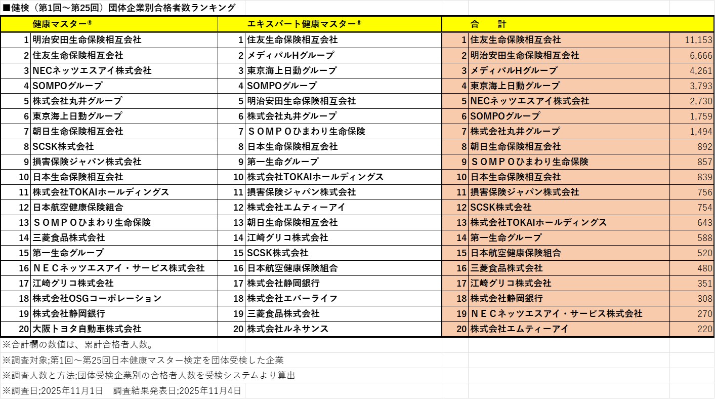 日本健康マスター検定【健検】の第1回試験(2017年2月)から第25回試験(2025年9-10月)までの合計「団体受検企業別合格者人数ランキングTOP20」を発表します。