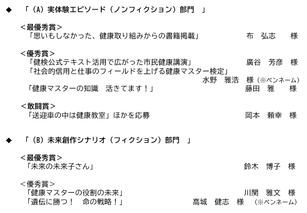 (A)実体験エピソード(ノンフィクション)部門 ー 募集対象=健康マスター(有資格者)、【健検】合格経験者
