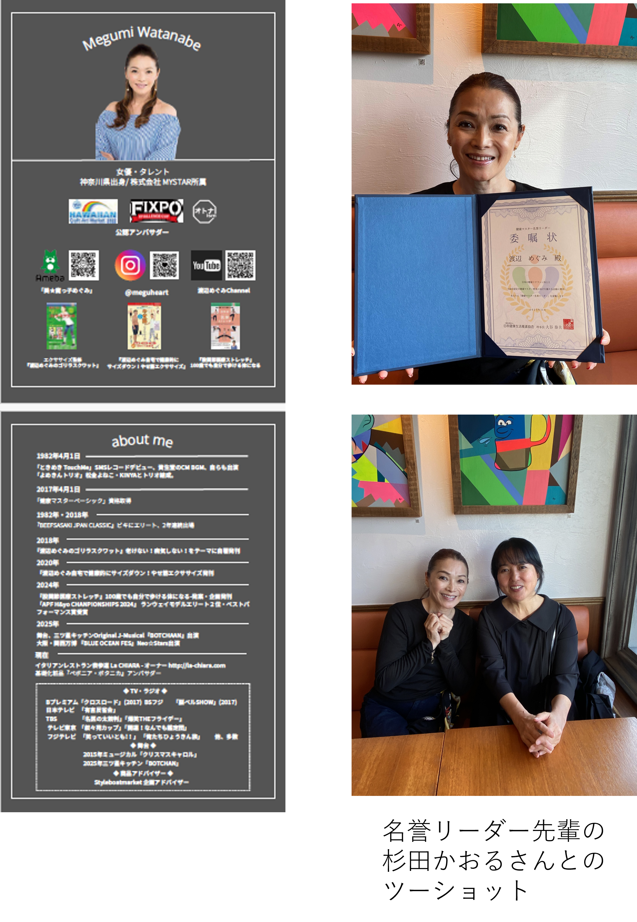 現在当協会には、【健検】の普及PR活動にご協力いただいている「健康マスター名誉リーダー」が杉田かおるさんを含め5名いらっしゃいますが、この度新たに6人目として、女優・タレントの渡辺めぐみさんに就任していただきました。渡辺さんは、1982年にレコードデビュー以来、長きにわたり芸能界で活躍されており、ここ10年ほどは筋トレを含む運動・ストレッチの分野でも書籍出版含め精力的に活動、「健康マスター®」の資格も既に2度更新をされました。今後は【健検】の普及PRに向け、協会と連携しながら様々な活動を展開する予定です。